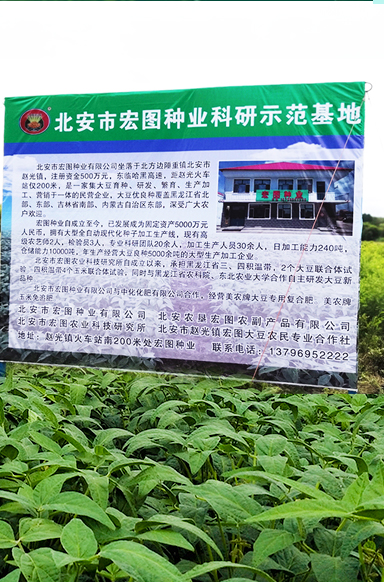 北安市宏圖種業有限公司是一家及大豆育種研發(fā)、生產加工、銷售于一體的種業企業 ,成立于2010年6月24日。公司坐落在北方邊陲重鎮北安市趙光鎮,公司擁有趙光農場、紅星農場、建設農場等多家良種繁育基地。得天獨厚的地理優(yōu)勢為繁育出優(yōu)質的大豆種子提供了便利的條件。
